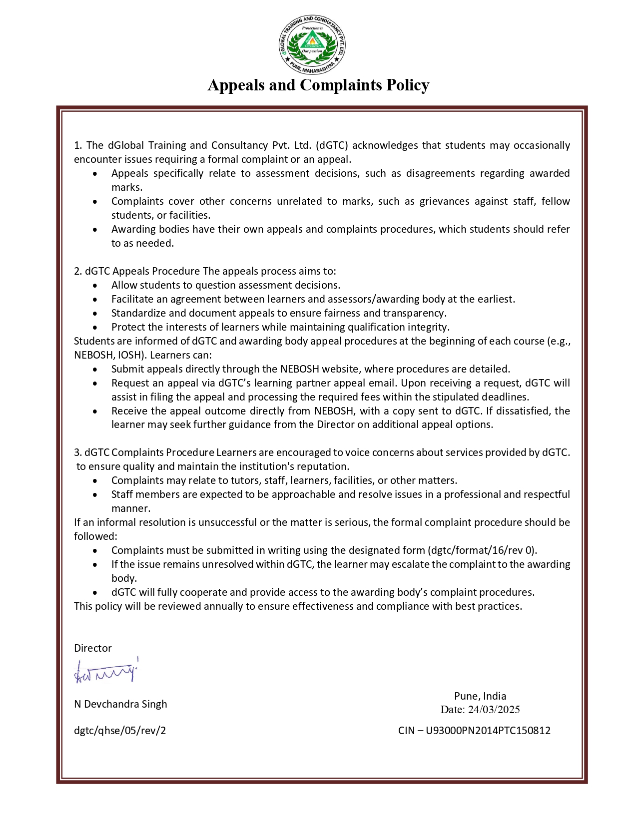dGTC recognizes rights of learner to appeal against the decision of the awarding bodies in relation to their qualification. The awarding bodies such as NEBOSH and IOSH has their own appeal policy and procedures and as course provider we follow them. dGTC also recognize supports the right of appeal by the students against the decision of outcome of the customized courses run by dGTC.